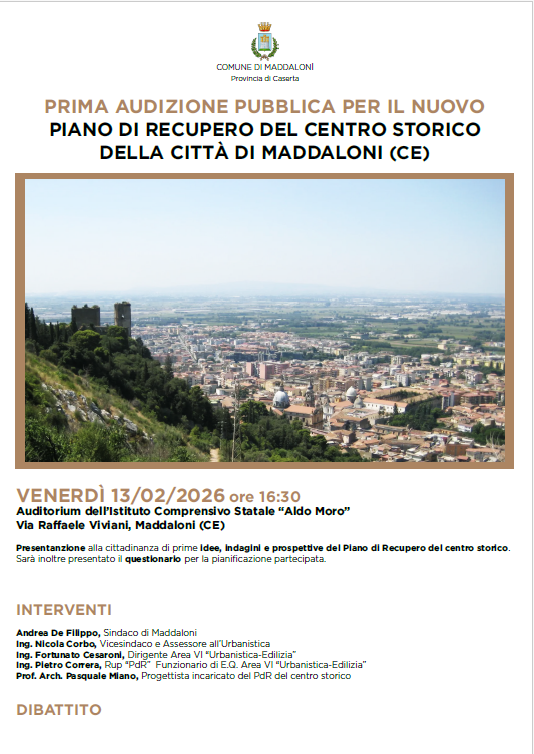 Il Comune di Maddaloni ha avviato l’iter per la redazione del nuovo Piano di recupero del centro Storico, uno strumento urbanistico particolareggiato di fondamentale importanza per la rigenerazione e riqualificazione del nostro nucleo urbano di interesse storico.